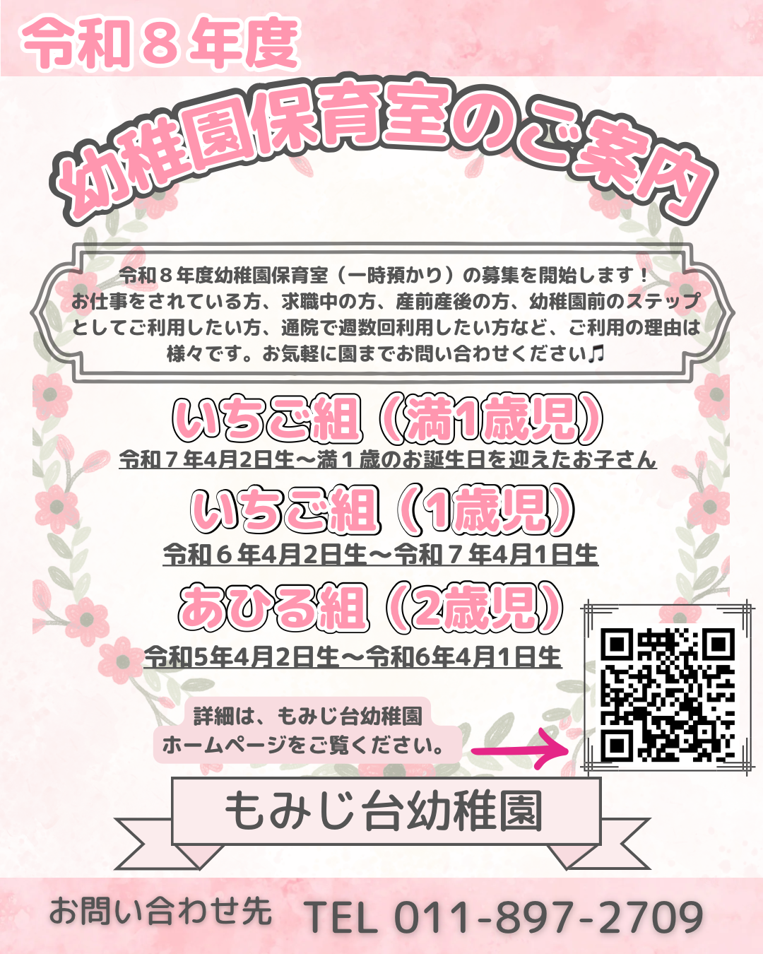 ご利用をお考えの方は、園までお問い合わせください📞011-897-2709