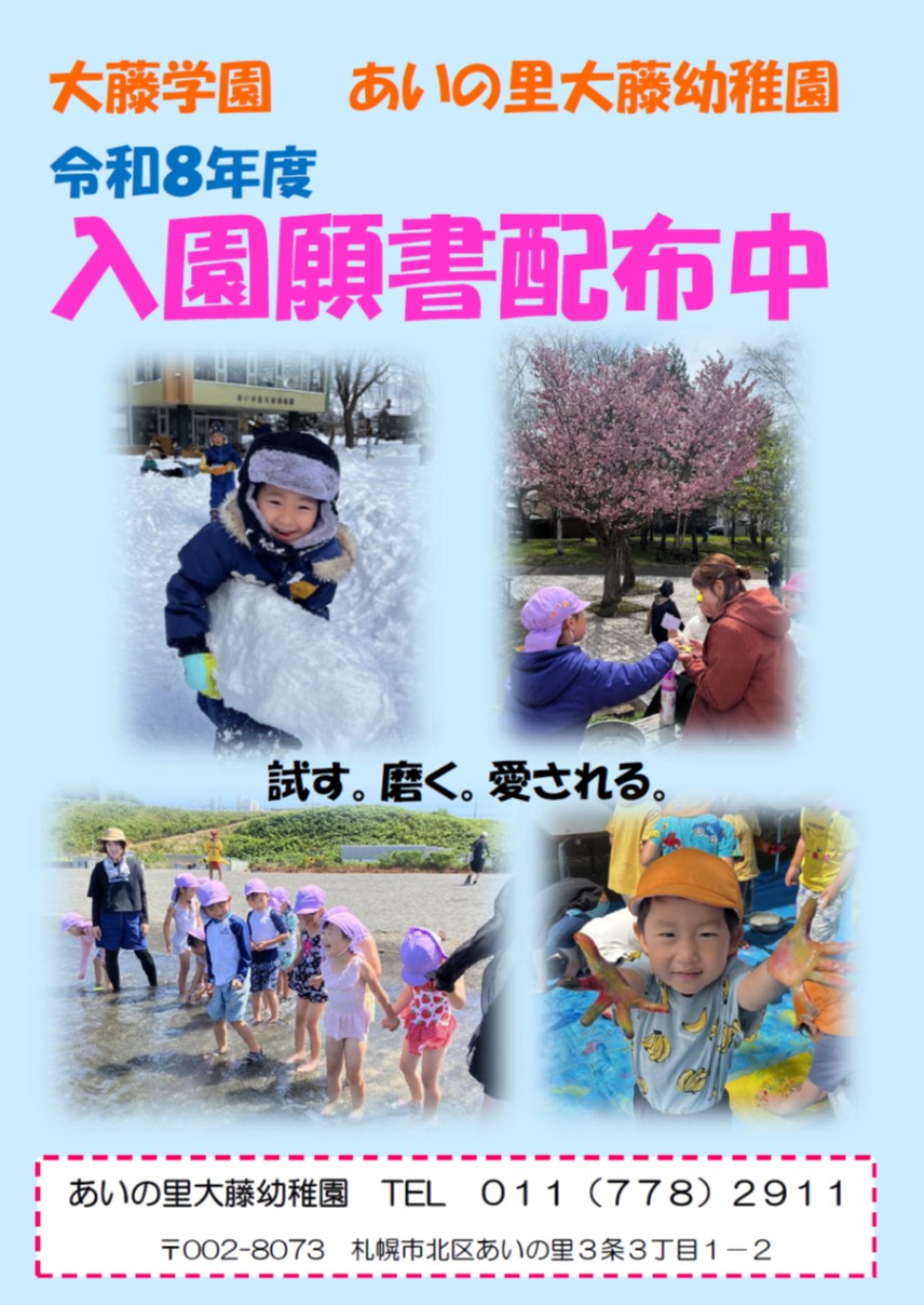 来年度、入園をご希望の方はあいの里大藤幼稚園(TEL 011-778-2911)までご連絡ください。