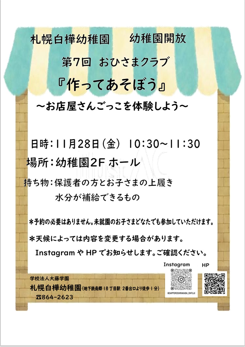 2025.11.26 第7回おひさまクラブ『作ってあそぼう~お店屋さんごっこ体験~』 11月28日(金)10:30~第7回おひさまクラブ『作ってあそぼう~お店屋さんごっこ体験~』を開催します。かばんを作って年長組のお店に遊びにいきましょう!ご参加お待ちしております。