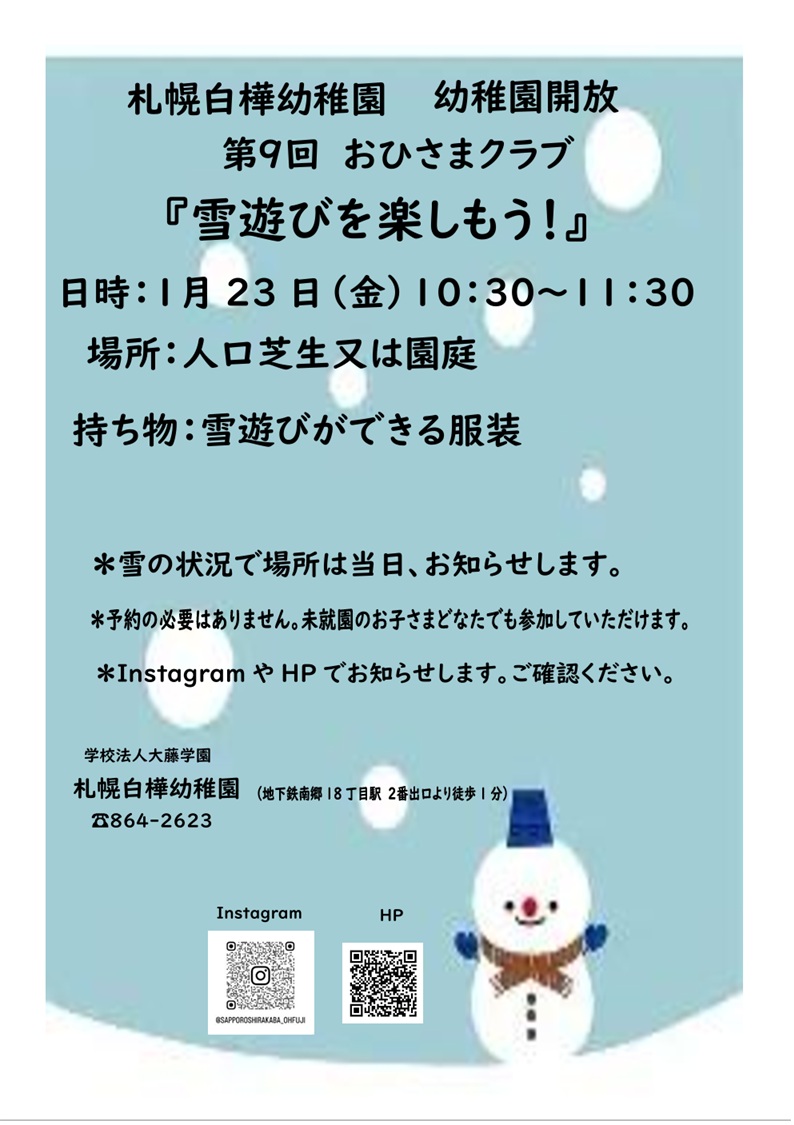 1月23日(金)第9回おひさまクラブ『雪で遊びを楽しもう!』を開催します。たくさんのご参加お待ちしております。