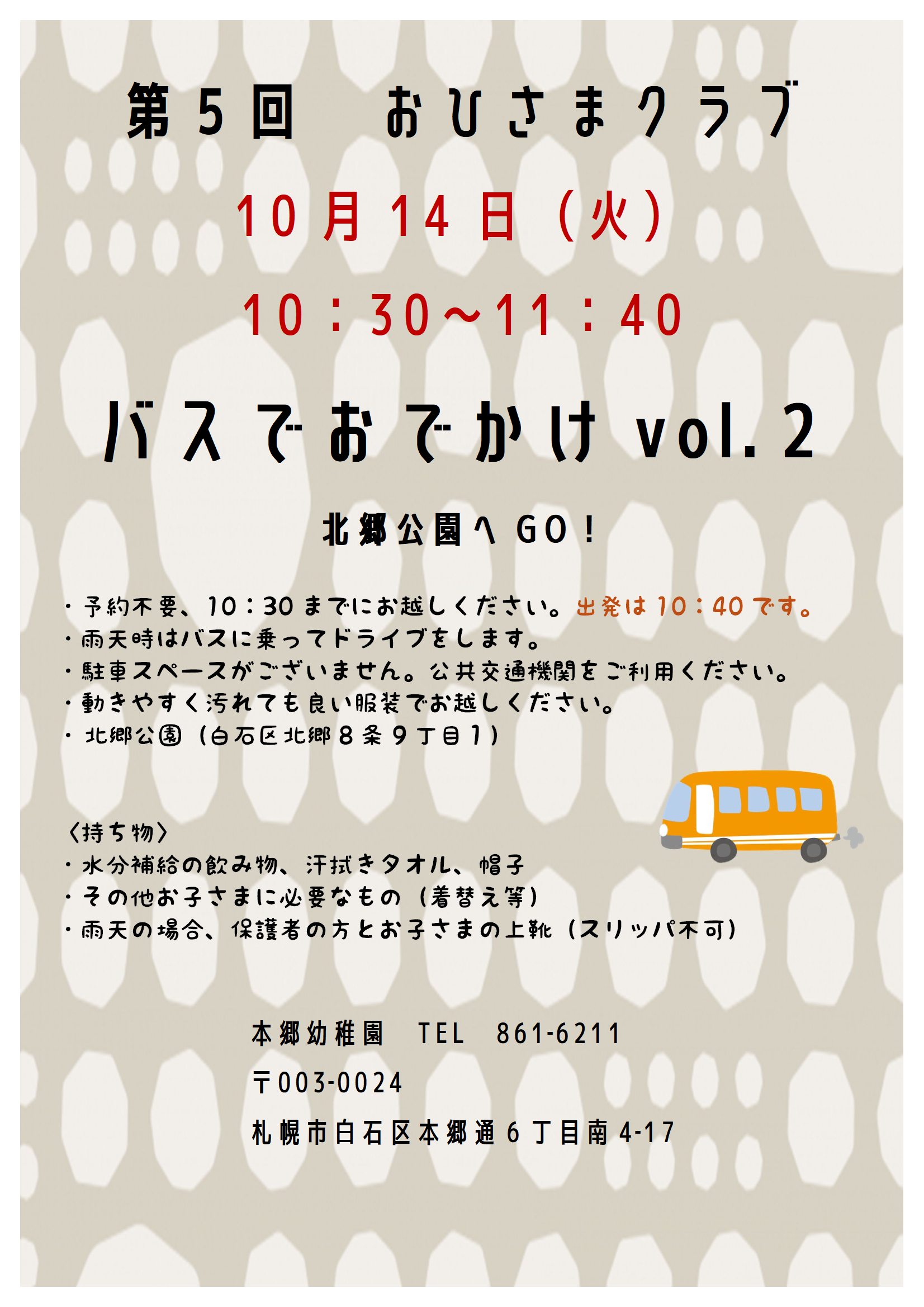10月14日(火)はおひさまクラブです。バスでお出かけの第2弾!今回は「北郷公園」にお出かけします🚌
